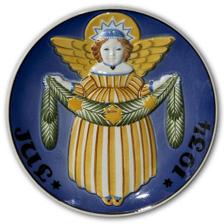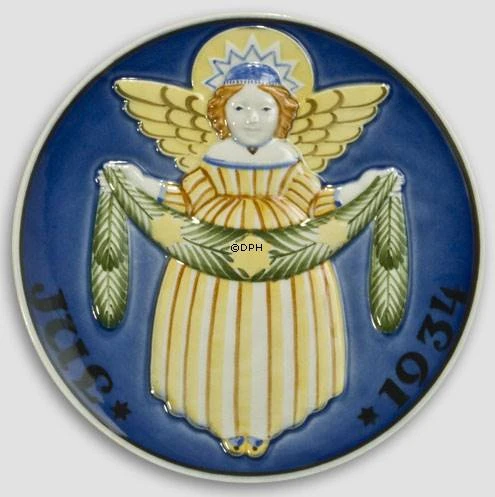 Aluminia Christmas plate,small, 1934 Year of issue: 1934 Motif: Angel with Spruce Festoon Technique: Faience Designed by: Hans Henrik Hansen Diameter: 6,2″ – 16 cm
