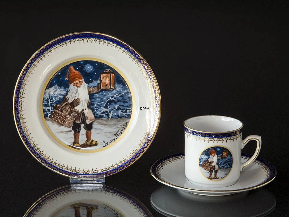 Jenny Nystrom Christmas cup and cake plate 1980 with motif of pixie with lantern and basket. Produced in colours in memory of Jenny Nystrom.