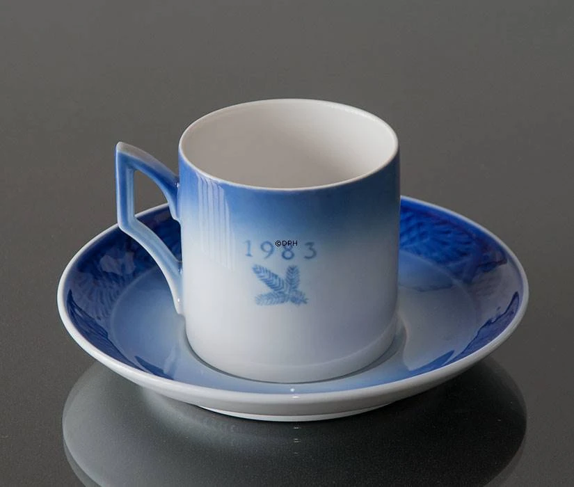 1983 Royal Copenhagen Christmas cup and saucer, designed by Kaj Lange, has the same motif as the 1983 Royal Copenhagen Christmas plate. The title of this Royal Copenhagen cup 1983 is Marry Christmas. The motif shows a familiy who are walking around the Christmas Tree while they are singing Christmas songs. All of the Royal Copenhagen cups are decorated under the glaze. The capacity is 1,5 dl.