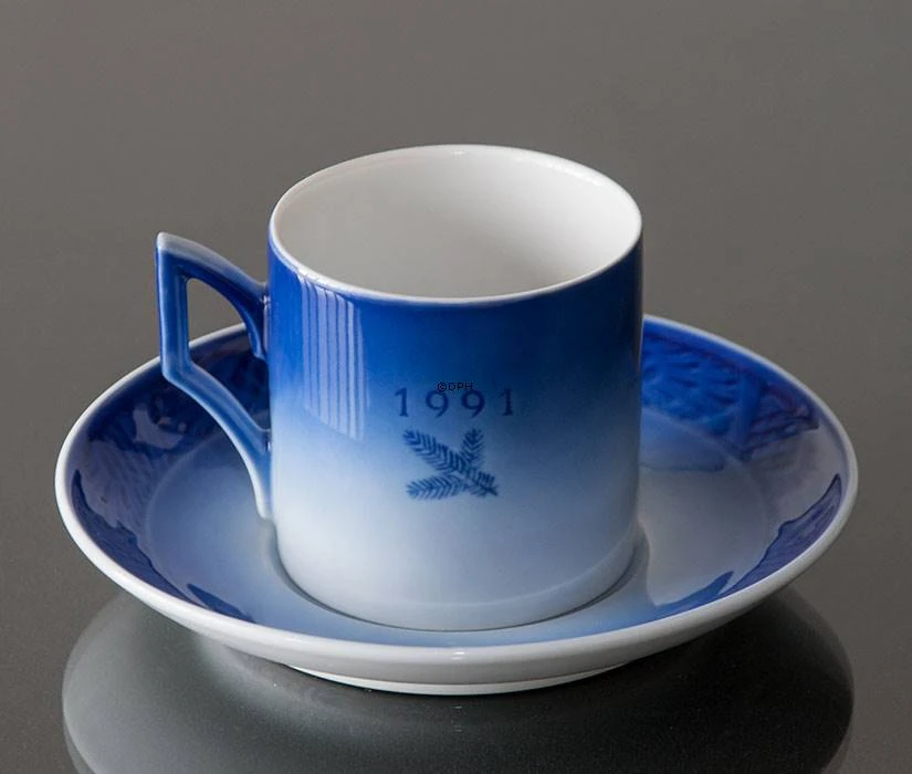 1991 Royal Copenhagen Christmas cup and saucer, designed by Sven Vestergaard, has the same motif as the 1991 Royal Copenhagen Christmas plate. The title of this Royal Copenhagen cup 1991 is The Festival og Santa Lucia. The motif shows the celebration of Saint Lucia in the church. All of the Royal Copenhagen cups are decorated under the glaze. The capacity is 1,5 dl.