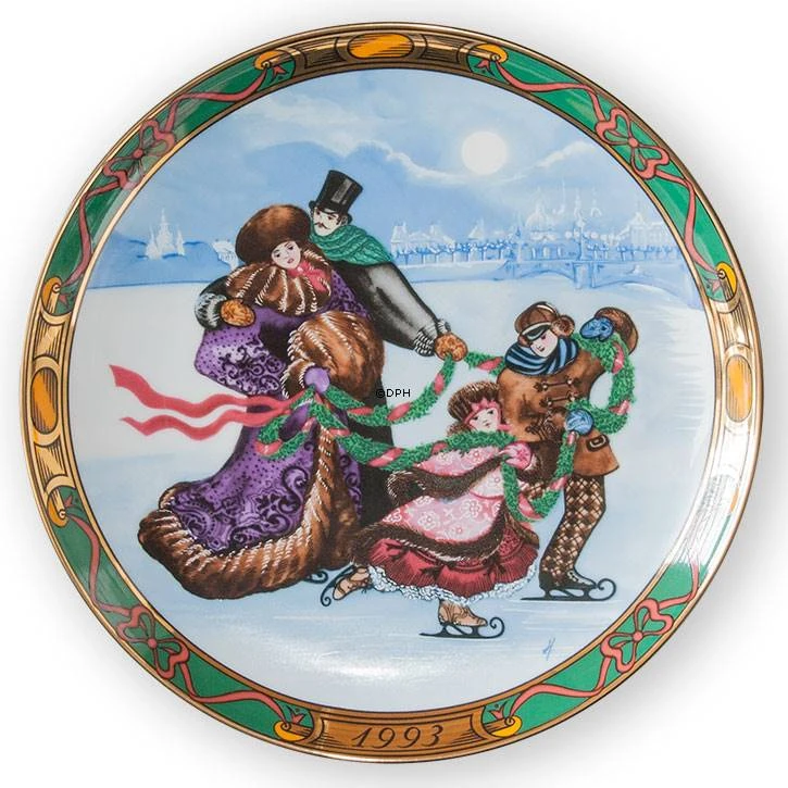 1993 Royal Copenhagen Christmas plate in the Christmas in Denmark series, designed by Hans Henrik Hansen. The title of this 1993 Christmas in Denmark plate is The Skating Party. Royal Copenhagen started this Christmas in Denmark series in 1991 and ended it in 1996. The philosophy of making the Christmas plates in this series was to created a Christmas plate which had more modern expression in colours and motifs than the highly appreciated blue Christmas plates. The motifs of the six beautiful Christmas plates in the Royal Copenhagen Christmas in Denmark series has all been inspired by a Danish family’s Christmas at the turn of the century. The technique used for this plate was serigraphy.