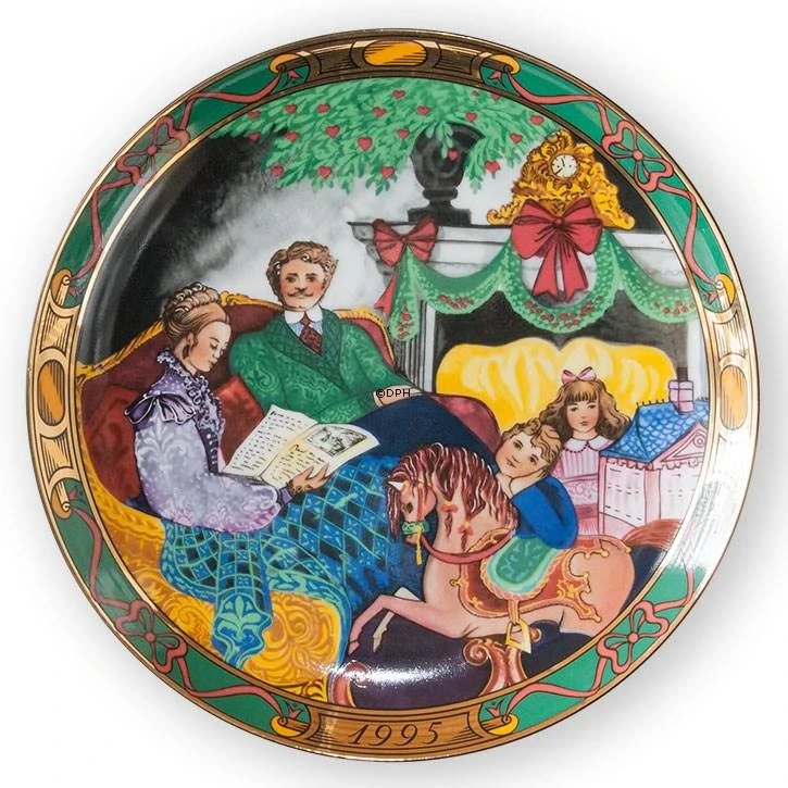 1995 Royal Copenhagen Christmas plate in the Christmas in Denmark series, designed by Hans Henrik Hansen. The title of this 1995 Christmas in Denmark plate is Christmas Tales. Royal Copenhagen started this Christmas in Denmark series in 1991 and ended it in 1996. The philosophy of making the Christmas plates in this series was to created a Christmas plate which had more modern expression in colours and motifs than the highly appreciated blue Christmas plates. The motifs of the six beautiful Christmas plates in the Royal Copenhagen Christmas in Denmark series has all been inspired by a Danish family’s Christmas at the turn of the century. The technique used for this plate was serigraphy.