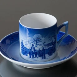 1997 Royal Copenhagen Christmas cup and saucer, designed by Sven Vestergaard, has the same motif as the 1997 Royal Copenhagen Christmas plate. The title of this Royal Copenhagen cup 1997 is Roskilde Cathedral. The motif shows a mother choosing a Christmas Tree together with her children in front of Roskilde Cathedral. All of the Royal Copenhagen cups are decorated under the glaze. The capacity is 1,5 dl.