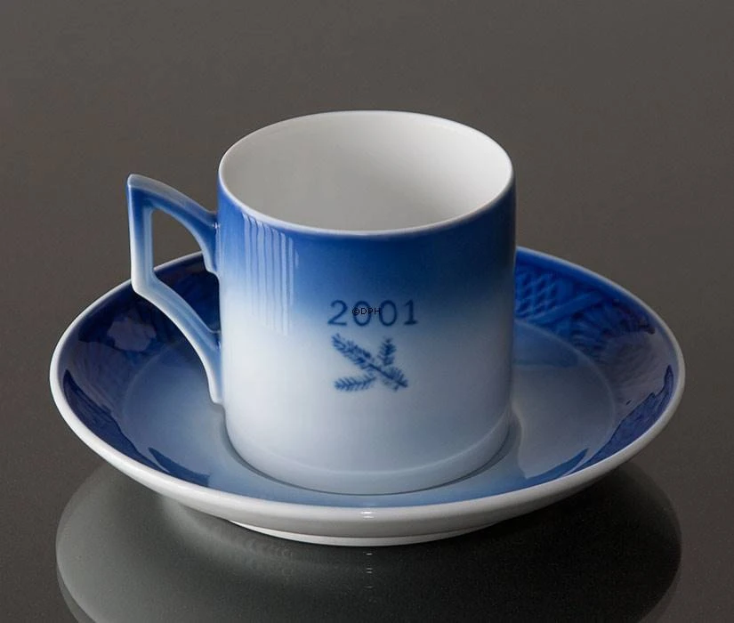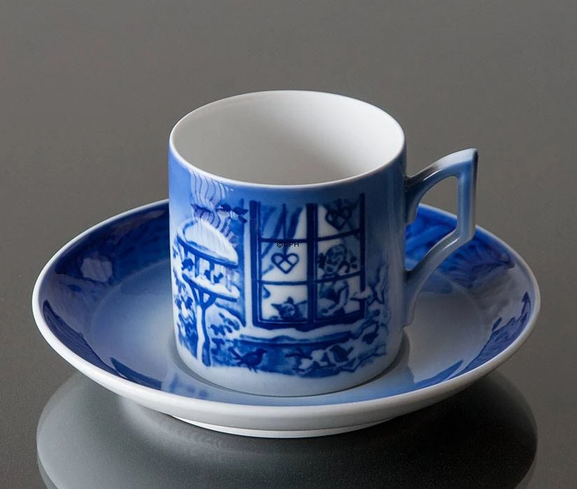 2001 Royal Copenhagen Christmas cup and saucer, designed by Sven Vestergaard, has the same motif as the 2001 Royal Copenhagen Christmas plate. The title of this Royal Copenhagen cup 2001 is Watching the Birds. The motif shows a girl who is watching the birds in the garden together with the cat. All of the Royal Copenhagen cups are decorated under the glaze. The capacity is 1,5 dl.