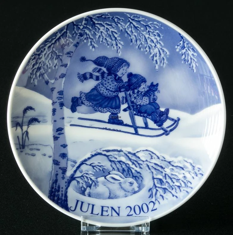 2002 Porsgrund Christmas plate, designed by Werner Grossmann, with the title Kick Sledding. The technique used for the 2002 Porsgrund Christmas plate was underglazed.