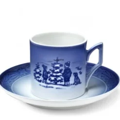2004 Royal Copenhagen Christmas cup and saucer, designed by Sven Vestergaard, has an extract from the motif of the 2004 Royal Copenhagen Christmas plate. The title of this Royal Copenhagen cup 2004 is Awaiting the Christmas Train. The motif shows two children with their dog. All of the Royal Copenhagen cups are decorated under the glaze. The capacity is 1,5 dl.