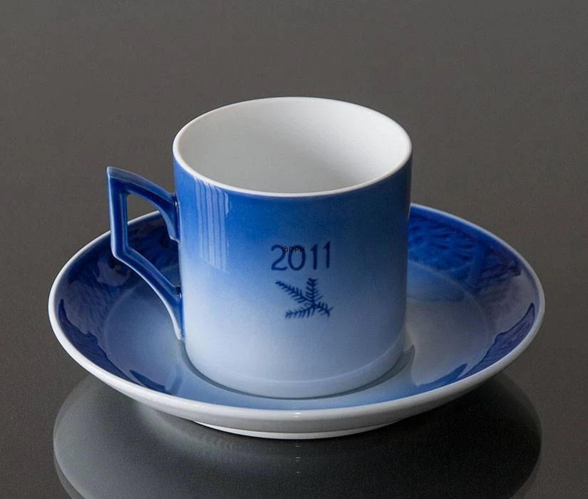 2011 Royal Copenhagen Christmas cup and saucer, designed by Sven Vestergaard, has an extract from the motif of the 2011 Royal Copenhagen Christmas plate. The title of this Royal Copenhagen cup 2011 is Waiting for Santa Claus. All of the Royal Copenhagen cups are decorated under the glaze. The capacity is 1,5 dl.
