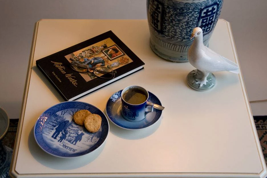 1979 Royal Copenhagen Christmas plate, designed by Kaj Lange, has the title Choosing a Christmas Tree. Royal Copenhagen’s Christmas plate from 1979 depicts a family choosing their Christmas tree. Among the many traditions upheld at Christmastime the decorated Christmas tree occupies an important place. So firmly is the custom associated with Christmas celebrations that most people assume it must be of a venerable age, stemming from the dim and ancient past. In actual fact, nobody knows for certain when it originated, but it can hardly be more than about 150 years ago. From Germany it spread, first to Scandi- navia,, and thereafter to large parts of the world. In the month of December, many families make an excursion to the nearest forest, to select the prettiest Christmas tree. Not until the Christmas tree is brought safely home are Christmas preparations really beginning to take shape.