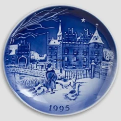 The motif of this 1995 Desiree Christmas plate from the Porcelain Factory Desiree, also known as Désirée Denmark, Svend Jensen of Denmark, Old Copenhagen Blue is found in the Hans Christian Andersen fairytale Everything in the Right Place. In the plate you see the Manor in the background while the young goose girl walks in the road in front. According to the Hans Christian Andersen’s fairytale the small girl hears galloping horses on the road behind her and she has to shoo away the geese, for them not to be run down by the lord of the manor and his hunting party. The Christmas plate was designed by Lis Torbol.