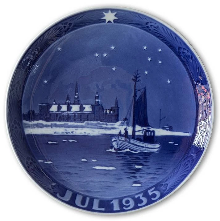 1935 Royal Copenhagen Christmas plate, designed by Chr. Benjamin Olsen, has the title Fishing boat south of Elsinore Castle. The 1935 Christmas plate depicts a fishing boat, with a Christmas Tree in the top of its mast, sailing off Elsinore castle,a renaissance castle, built 1574-1585 by Frederik II with the purpose of collecting tolls from passing ships. The castle is known all over the world as the scenery of Shakespeare’s Hamlet. Hamlet was first performed at Elsinore castle in 1816. Since then Elsinore castlehas often been the scenery of Shakespeare productions. Royal Copenhagen Christmas plate 1935 was only produced in 1935.