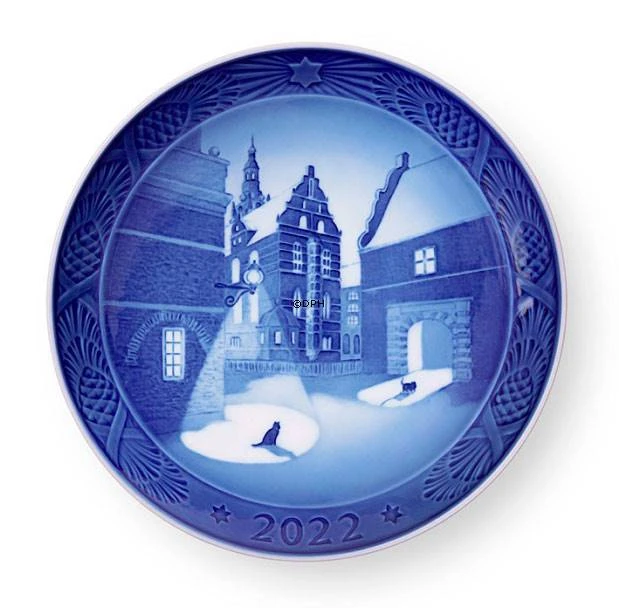 2022 Royal Copenhagen Christmas plate, designed by Allan Therkelsen, has the title Frederiksborg Castle.