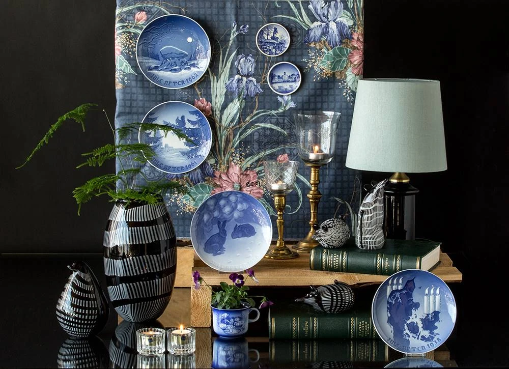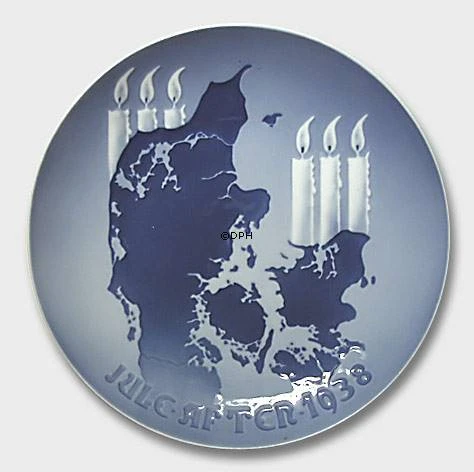 1938 Bing & Grondahl Christmas plate, designed by Immanuel Tjerne, has the title Lighting the Candles. Bing & Grondahl’s Christmas plate from 1938 depicts a map of Denmark, and this plate is one of the most original. The lit candles on top of Jutland and Sealand symbolize the candles worn in a garland by the Lucia bride during the Lucia prosession. The Lucia tradition came from Sweden, and is held on December 13th, which was earlier considered to be the shortest day of the year.