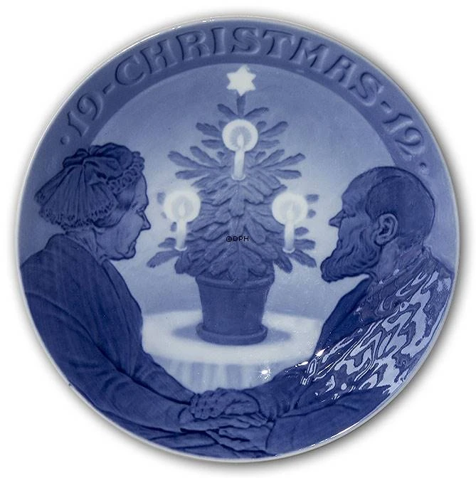 Collectibles: Christmas plate with english text – Christmas 1912 Motif: Elderly couple at the Christmas Tree Year of Release: 1912 Technique: Underglazed Designer: Chr. Thomsen Diameter: 7″ – 18 cm