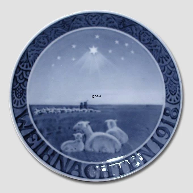 Royal Copenhagen Christmas plate with German text – Weihnachten Motif: The Shepherds in the Field on Christmas Night Year of Release: 1918 Technique: Underglazed Designer: R. Bøcher Diameter: 7″ – 18 cm