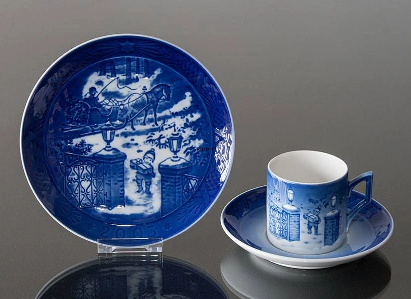 Royal Copenhagen’s Christmas plate from 2003 illustrates the special Christmas spirit that spreads warmth in winter. This plate shows a small boy excitedly taking a Christmas present to its recipient. The garden gate is already open in a welcoming gesture, and on a sleigh behind him is his father waiting with this year’s Christmas tree. They are about to drive home together over the crisp snow through the silent forest.