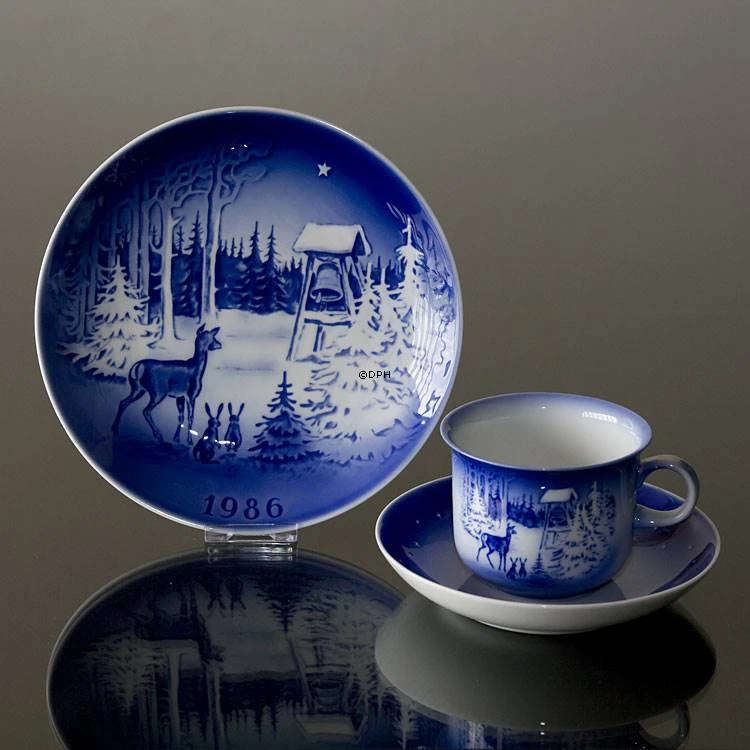 The motif of this 1986 Desiree Christmas plate from the Porcelain Factory Desiree, also known as DĂ©sirĂ©e Denmark, Svend Jensen of Denmark, Old Copenhagen Blue is found in the Hans Christian Andersen fairytale The Bell. In the city in Hans Christian Andersen’s fairytale “The Bell” it sounds like a church bell is ringing deep inside the quiet fragrant forest. But no one has been so deep in the forest that they have been able to find the bell with the heavenly tones. Probably only the animals in the forest know where the bell is. Svend Otto S. has created this Christmas plate from Desiree.