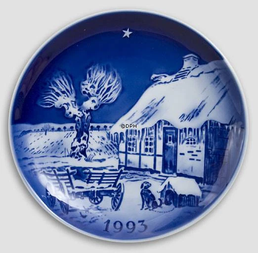 The motif of this 1993 Desiree Christmas plate from the Porcelain Factory Desiree, also known as Désirée Denmark, Svend Jensen of Denmark, Old Copenhagen Blue is The Old Farmhouse which is found in the Hans Christian Andersen fairytale What the Old Man Does is Always Right. Hans Christian Andersen starts his fairytale “What the Old Man Does is Always Right” with a description of a little cottage in the country. Svend Otto S., the well known Hans Christian Andersen illustrator, has catched the mood in the fairytale and painted the small cottage at wintertime with its lovely thatched roof, the small low windows, the old tree and the chained dog.