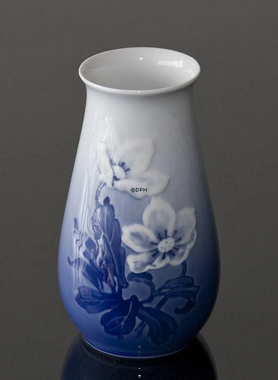 Collectibles: Vase Motif: Christmas Rose, white Technique: Underglazed Grounding: Blue toned Designed by: Height: 5″ – 14 cm