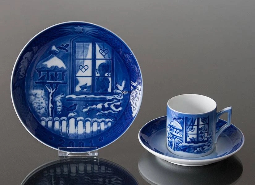 2001 Royal Copenhagen Christmas plate, designed by Sven Vestergaard, has the title Watching the Birds. Royal Copenhagen’s Christmas plate from 2001 is entitled Watching the birds, which has been has been inspired by one of the special traditions of winter and Christmas. Most creatures in the northern latitudes have trouble finding food in the winter when the ground is frozen. This is why it is a special custom in many homes to feed nature’s many birds and animals. The plate shows a little girl in a cosy sitting room with her cat, looking out of the Christmas decorated window at the birds. The winter darkness has fallen, and all is peaceful.